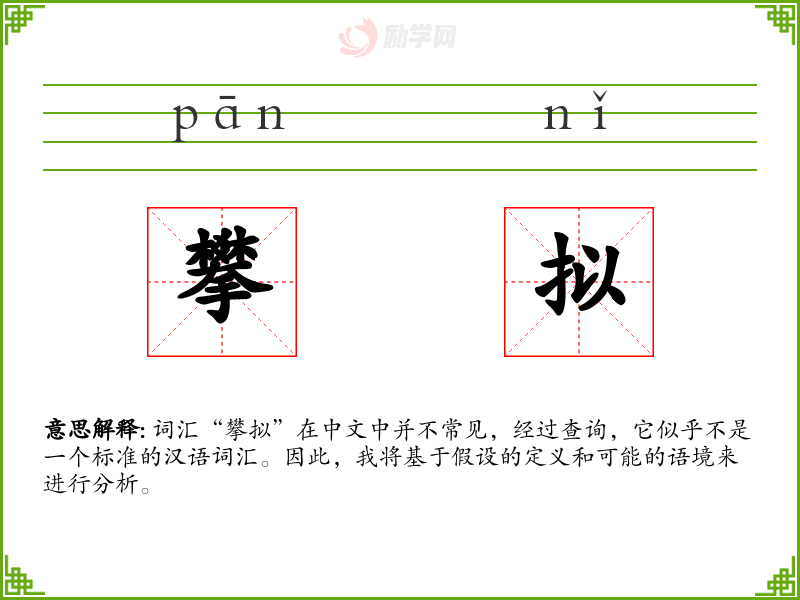 词汇“攀拟”在中文中并不常见,经过查询,它似乎不是一个标准的汉语词汇。因此,我将基于假设的定义和可能的语境来进行分析。