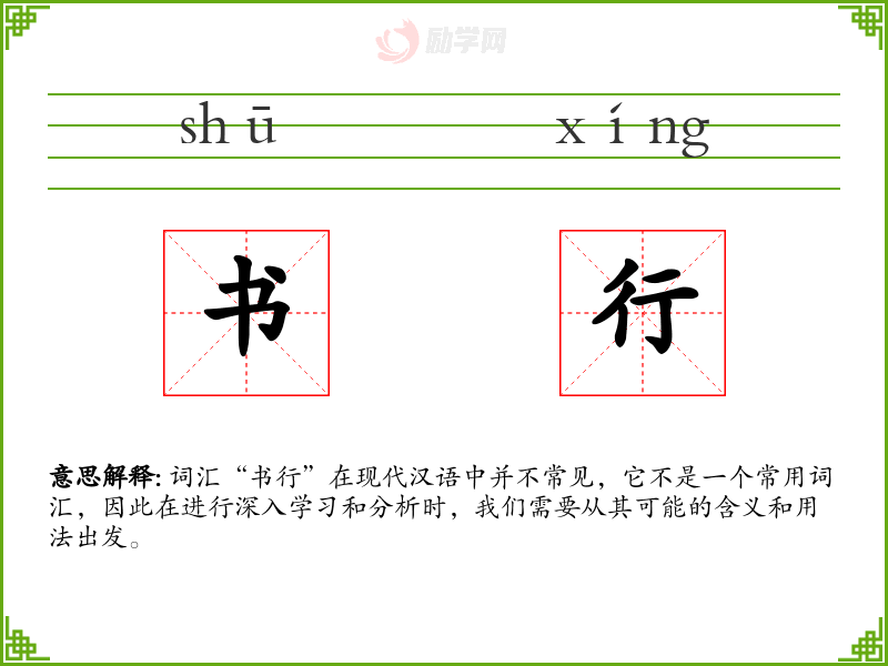 - 反义词:(由于“书行”不是一个常用词汇,反义词不明显)