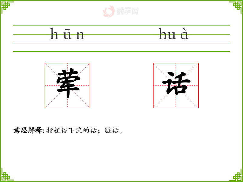 话[ huà ] 1. (形声。从言,舌声。本义:言语)。 2. 同本义。 【引证】 《说文》-话,合会善言也。 《左传·文公六年》-著之话言。 《左传·文公十八年》-不知话言。 《左传·襄公元年》-告之话言。 《诗·大雅·板》-出话不然。 晋·陶渊明《归去来兮辞》-悦亲戚之情话。 唐·李朝威《柳毅传》-心诚之话。 【组词】 话言、 话差、 话白儿、 话布口袋 [更多解释]