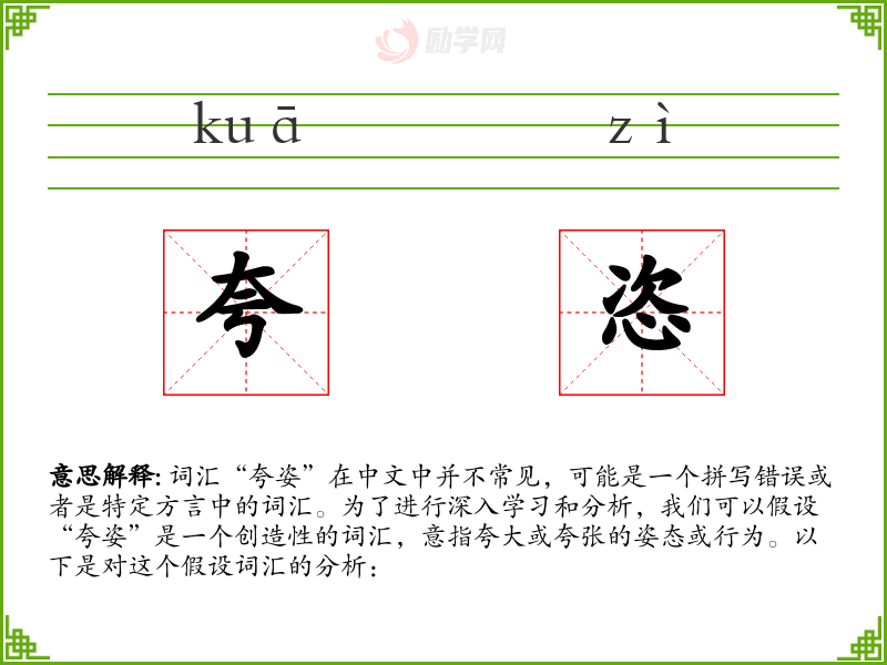 词汇“夸姿”在中文中并不常见,可能是一个拼写错误或者是特定方言中的词汇。为了进行深入学习和分析,我们可以假设“夸姿”是一个创造性的词汇,意指夸大或夸张的姿态或行为。以下是对这个假设词汇的分析: