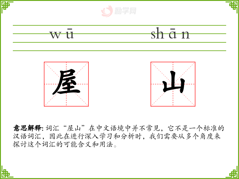 词汇“屋山”在中文语境中并不常见,它不是一个标准的汉语词汇,因此在进行深入学*和分析时,我们需要从多个角度来探讨这个词汇的可能含义和用法。