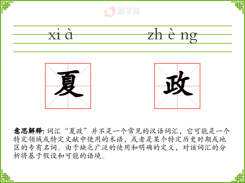 “夏政”作为一个特定或不太常见的词汇,其意义和应用可能受限于特定语境。在语言学习和表达中,了解这样的词汇有助于丰富词汇量和理解特定领域的专业术语。
