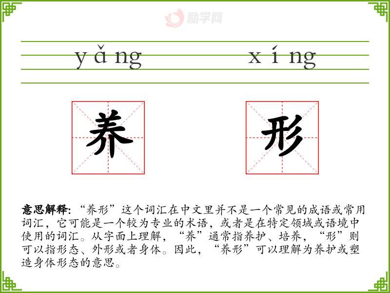 “养形”这个词汇在中文里并不是一个常见的成语或常用词汇,它可能是一个较为专业的术语,或者是在特定领域或语境中使用的词汇。从字面上理解,“养”通常指养护、培养,“形”则可以指形态、外形或者身体。因此,“养形”可以理解为养护或塑造身体形态的意思。
