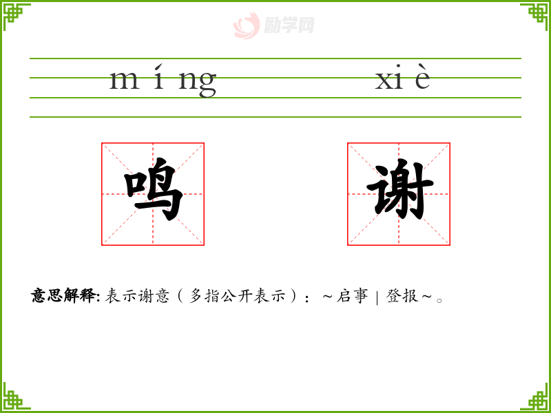 《说文》-鸣,鸟声也。 《管辂别传》-鸟兽之音曰鸣。 《易·中孚》-鸣鹤在阴。 《诗·大雅·卷阿》-凤皇鸣矣。 《诗·鸡鸣》-鸡既鸣矣,朝既盈矣。 陶渊明《归园田居》-狗吠深巷中,鸡呜桑树巅。