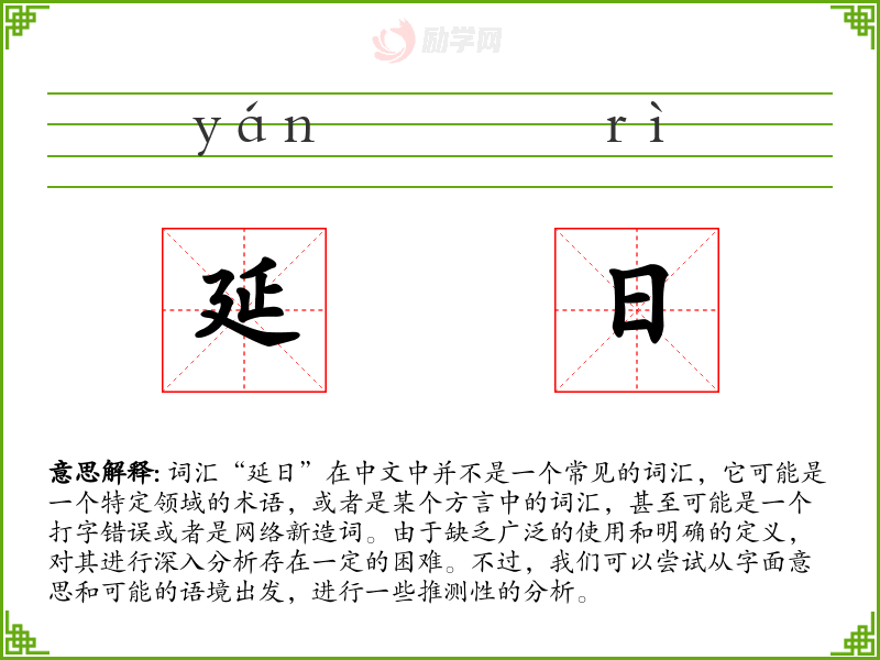 由于“延日”不是一个标准词汇,对其的理解和应用需要谨慎。在语言学习和表达中,了解词汇的准确含义和使用语境是非常重要的。如果“延日”是一个特定领域的术语,那么在相关领域工作或学习时,了解其含义将有助于更好地沟通和理解。