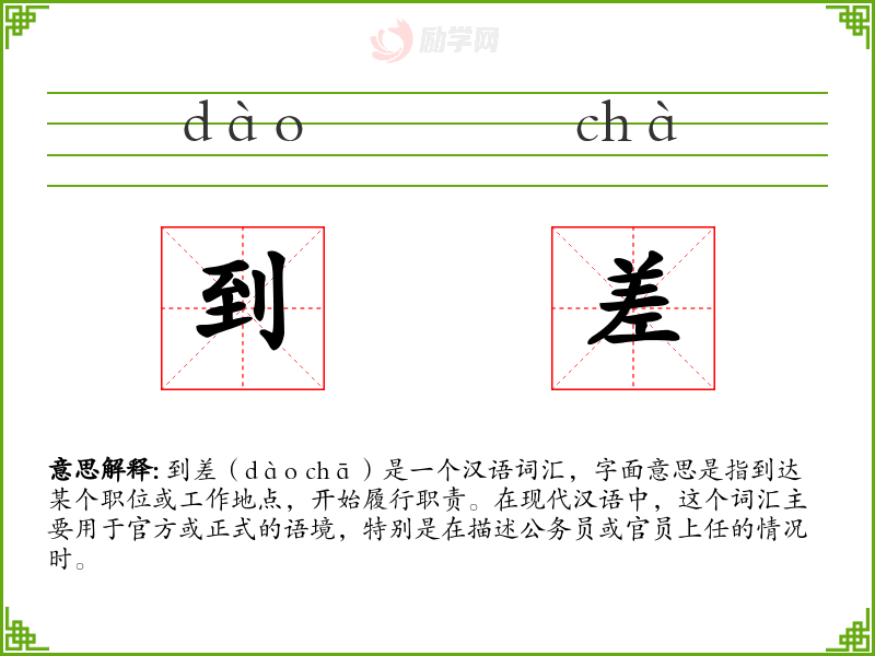到差(dào chā)是一个汉语词汇,字面意思是指到达某个职位或工作地点,开始履行职责。在现代汉语中,这个词汇主要用于官方或正式的语境,特别是在描述公务员或官员上任的情况时。