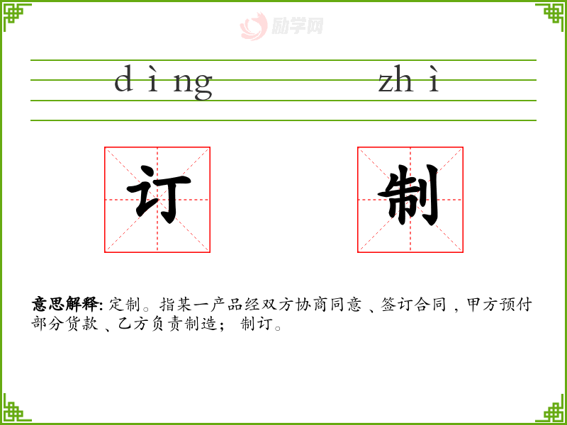 订制的意思是:定制。指某一产品经双方协商同意﹑签订合同﹐甲方预付部分货款﹑乙方负责制造; 制订。
