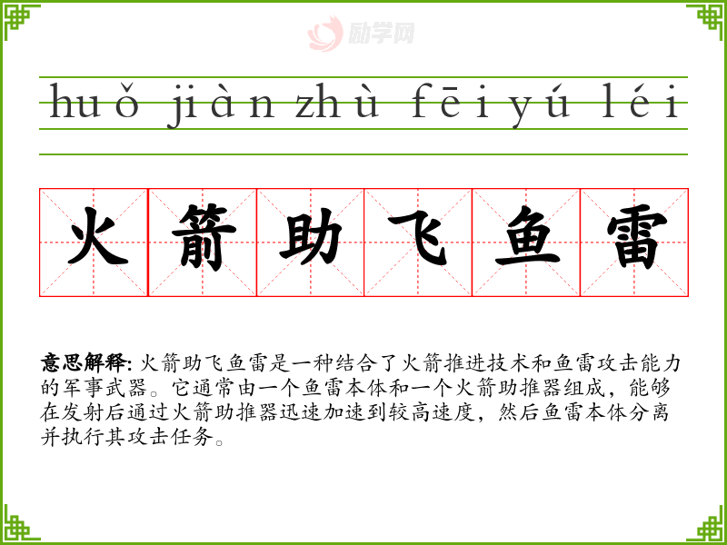 火箭助飞鱼雷的拼音是:huǒ jiàn zhù fēi yú léi