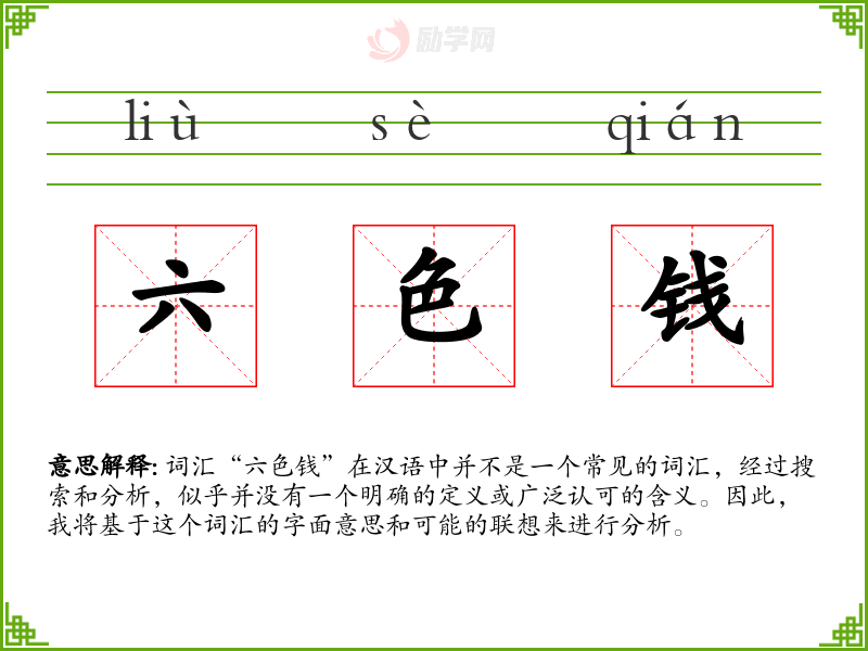 词汇“六色钱”在汉语中并不是一个常见的词汇,经过搜索和分析,似乎并没有一个明确的定义或广泛认可的含义。因此,我将基于这个词汇的字面意思和可能的联想来进行分析。