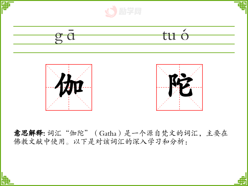 词汇“伽陀”(Gatha)是一个源自梵文的词汇,主要在*文献中使用。以下是对该词汇的深入学和分析: