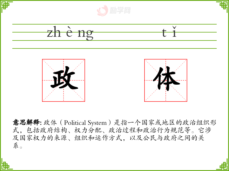 政体(Political System)是指一个国家或地区的政治组织形式,包括政府结构、权力分配、政治过程和政治行为规范等。它涉及国家权力的来源、组织和运作方式,以及公民与政府之间的关系。