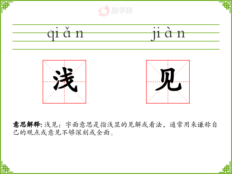 浅见:字面意思是指浅显的见解或看法,通常用来谦称自己的观点或意见不够深刻或全面。