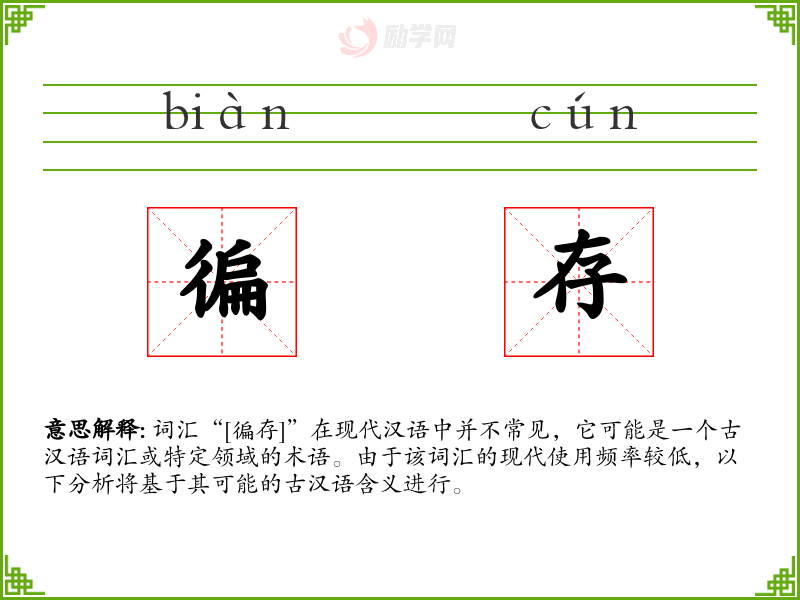 词汇“[徧存]”在现代汉语中并不常见,它可能是一个古汉语词汇或特定领域的术语。由于该词汇的现代使用频率较低,以下分析将基于其可能的古汉语含义进行。