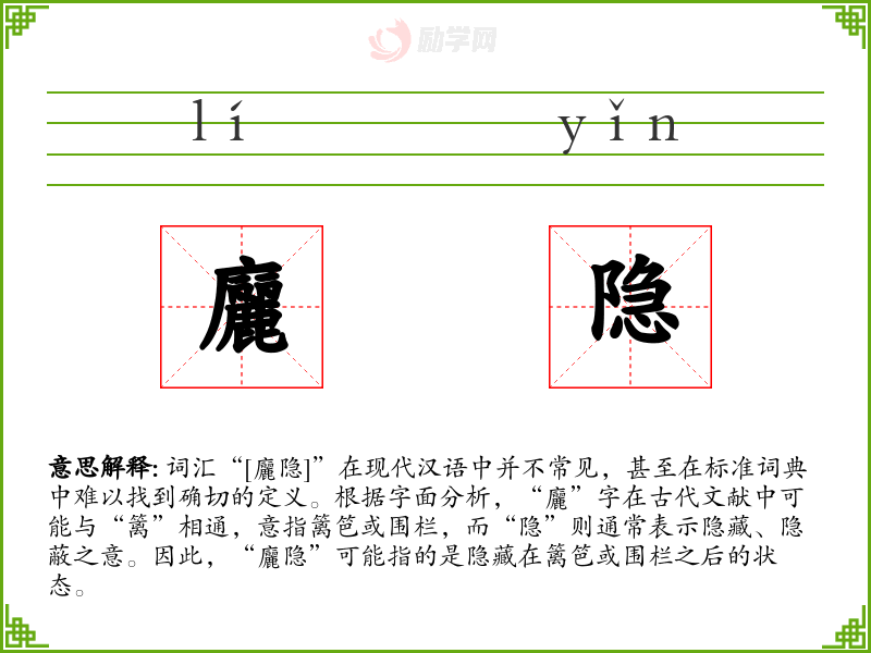 词汇“[廲隐]”在现代汉语中并不常见,甚至在标准词典中难以找到确切的定义。根据字面分析,“廲”字在古代文献中可能与“篱”相通,意指篱笆或围栏,而“隐”则通常表示隐藏、隐蔽之意。因此,“廲隐”可能指的是隐藏在篱笆或围栏之后的状态。