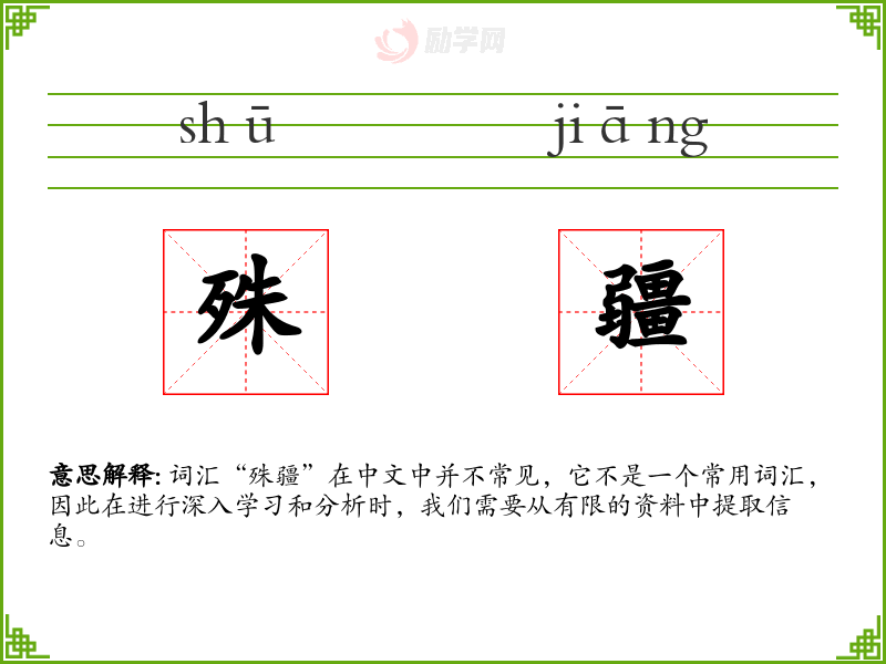 由于“殊疆”不是一个常用词汇,它在文学、口语或专业领域中的使用非常有限。可能在一些特定的文学作品或学术论文中,为了表达特殊的领域或界限时会使用到这个词。