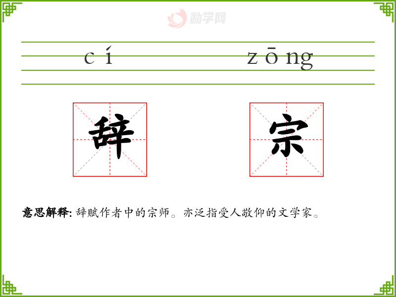 辞宗的意思是:辞赋作者中的宗师。亦泛指受人敬仰的文学家。