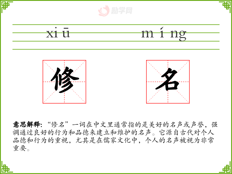 “修名”一词在中文里通常指的是美好的名声或声誉,强调通过良好的行为和品德来建立和维护的名声。它源自古代对个人品德和行为的重视,尤其是在儒家文化中,个人的名声被视为非常重要。