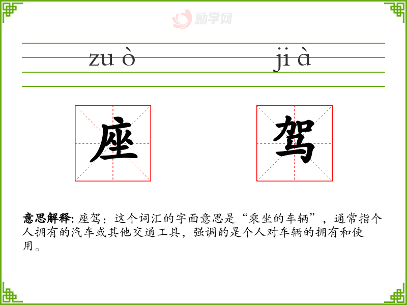 座驾:这个词汇的字面意思是“乘坐的车辆”,通常指个人拥有的汽车或其他交通工具,强调的是个人对车辆的拥有和使用。