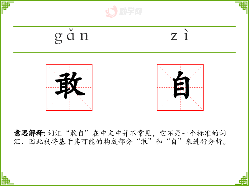词汇“敢自”在中文中并不常见,它不是一个标准的词汇,因此我将基于其可能的构成部分“敢”和“自”来进行分析。