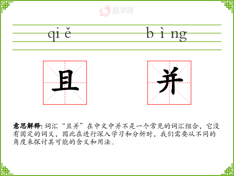 词汇“且并”在中文中并不是一个常见的词汇组合,它没有固定的词义,因此在进行深入学习和分析时,我们需要从不同的角度来探讨其可能的含义和用法。