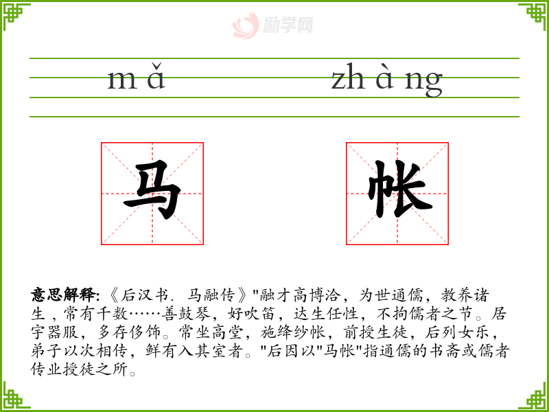 《后汉书.马融传》"融才高博洽,为世通儒,教养诸生﹐常有千数……善鼓琴,好吹笛,达生任性,不拘儒者之节。居宇器服,多存侈饰。常坐高堂,施绛纱帐,前授生徒,后列女乐,弟子以次相传,鲜有入其室者。"后因以"马帐"指通儒的书斋或儒者传业授徒之所。