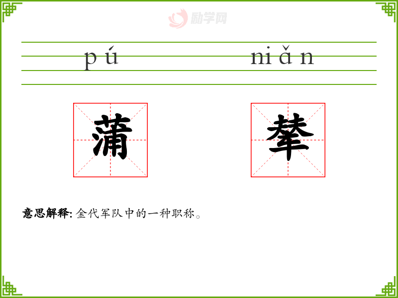 蒲[ pú ] 1. (形声。从水丱,浦声。本义:植物名。香蒲)。 2. 同本义。 【引证】 《说文》-蒲,水草也。可以作席。 《诗·陈风·泽陂》-有蒲与荷。 《周礼·泽虞》。注:“以为席。”-共其苇蒲之事。 《周礼·大宗伯》。注:“蒲为席,所以安人。”-男执蒲璧。 【组词】 蒲甸儿、 蒲柳、 蒲草毛窝、 蒲鞭示辱、 蒲帆 [更多解释]