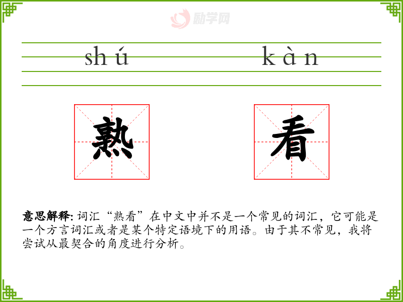 词汇“熟看”在中文中并不是一个常见的词汇,它可能是一个方言词汇或者是某个特定语境下的用语。由于其不常见,我将尝试从最契合的角度进行分析。