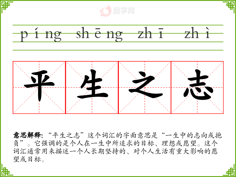 “平生之志”这个词汇的字面意思是“一生中的志向或抱负”。它强调的是个人在一生中所追求的目标、理想或愿望。这个词汇通常用来描述一个人长期坚持的、对个人生活有重大影响的愿望或目标。