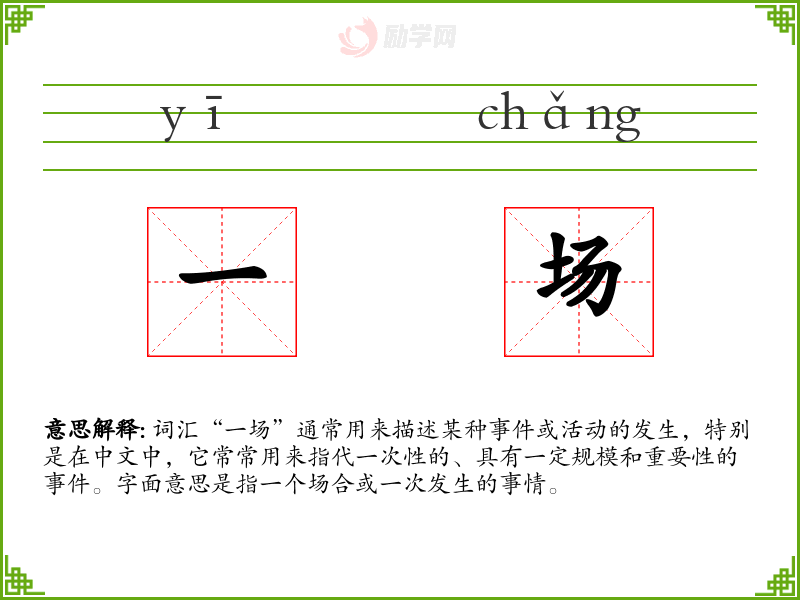 词汇“一场”通常用来描述某种或活动的发生,特别是在中文中,它常常用来指代一次性的、具有一定规模和重要性的。字面意思是指一个场合或一次发生的事情。