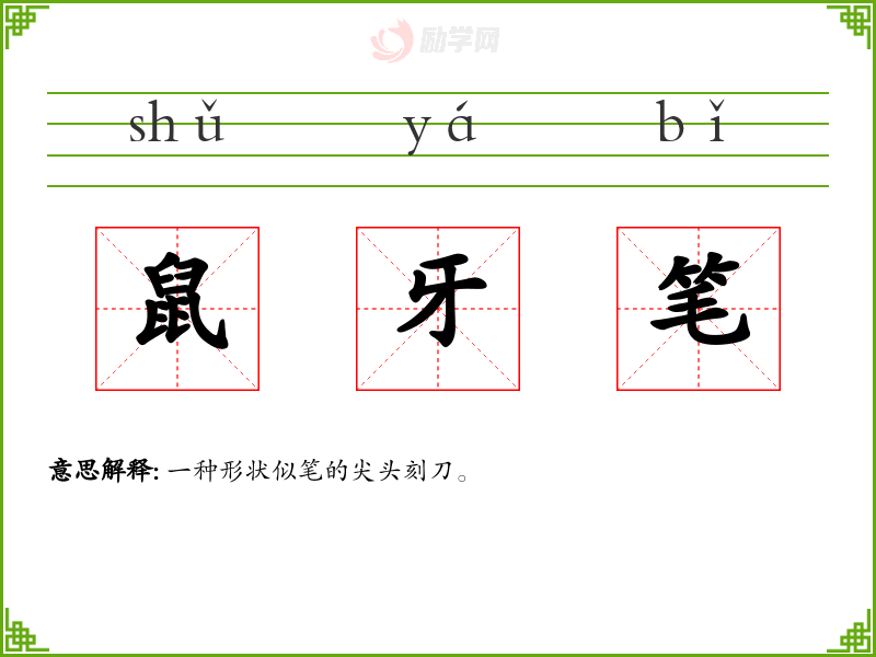 鼠牙笔的意思是:一种形状似笔的尖头刻刀。