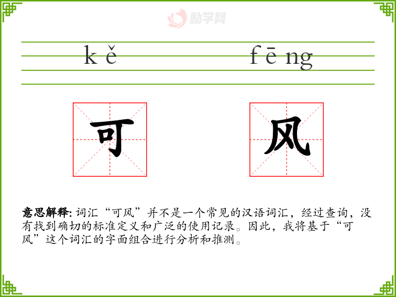 词汇“可风”并不是一个常见的汉语词汇,经过查询,没有找到确切的标准定义和广泛的使用记录。因此,我将基于“可风”这个词汇的字面组合进行分析和推测。
