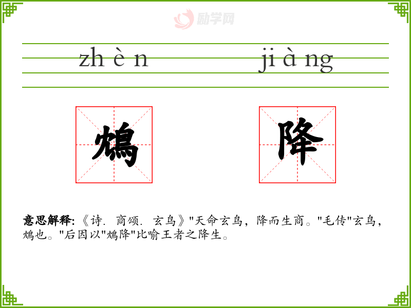 鴆降的意思是:《诗.商颂.玄鸟》"天命玄鸟,降而生商。"毛传"玄鸟,鴆也。"后因以"鴆降"比喻王者之降生。