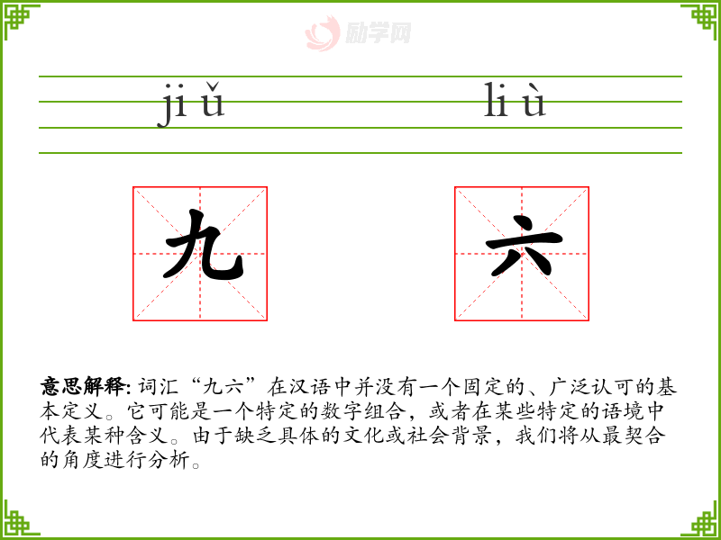 由于“九六”不是一个常用词汇,它在不同语境下的使用非常有限。可能在一些特定的领域或私人对话中,它被赋予了特殊的含义。