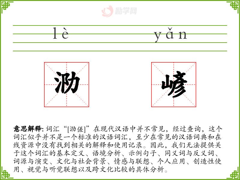 由于“[泐傞]”不是一个已知的词汇,我们无法对其进行深入的学习和分析。如果你有更多的上下文信息或者是指的另一个词汇,请提供更多的信息,以便我们能够提供更准确的分析和帮助。