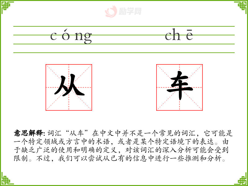 由于“从车”不是一个标准词汇,我们无法尝试将其融入到诗歌、故事或其他创作中。