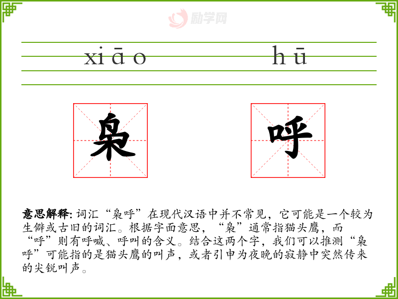 - 专业领域:在鸟类学或生态学中,可能会用到“枭呼”来描述猫头鹰的叫声。
