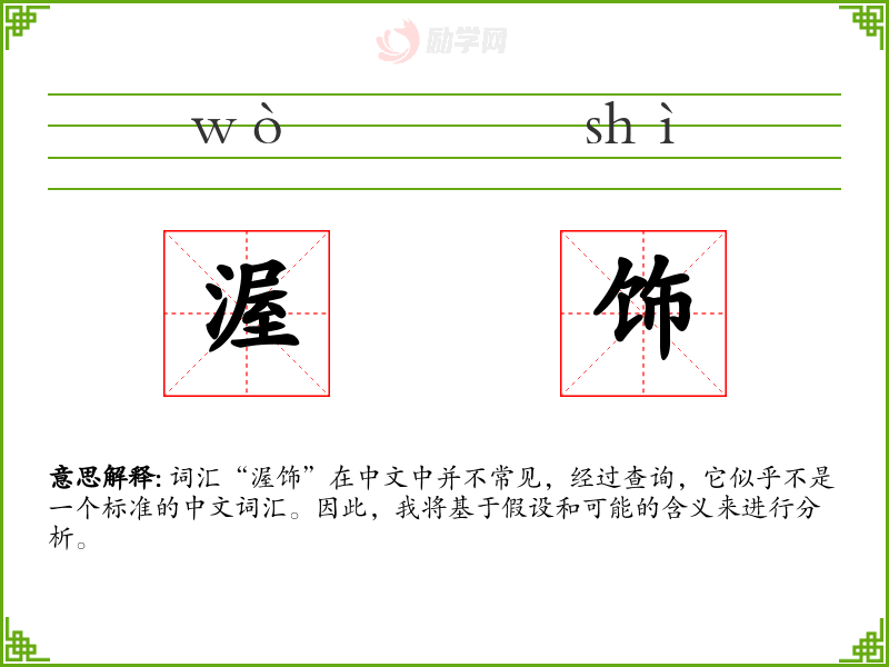 词汇“渥饰”在中文中并不常见,经过查询,它似乎不是一个标准的中文词汇。因此,我将基于假设和可能的含义来进行分析。