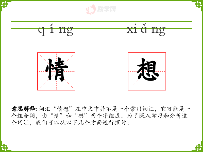 词汇“情想”在中文中并不是一个常用词汇,它可能是一个组合词,由“情”和“想”两个字组成。为了深入学习和分析这个词汇,我们可以从以下几个方面进行探讨: