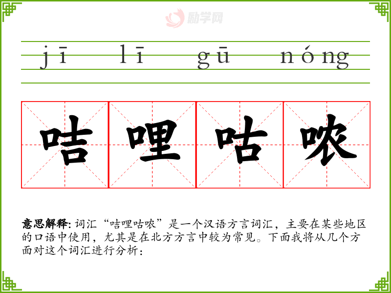 “咭哩咕哝”这个词汇虽然在标准汉语中不常见,但在方言中却有其独特的表达功能和情感色彩。了解和学习这样的词汇,有助于更全面地理解汉语的多样性和丰富性。