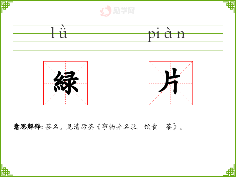 緑片的意思是:茶名。见清厉荃《事物异名录.饮食.茶》。