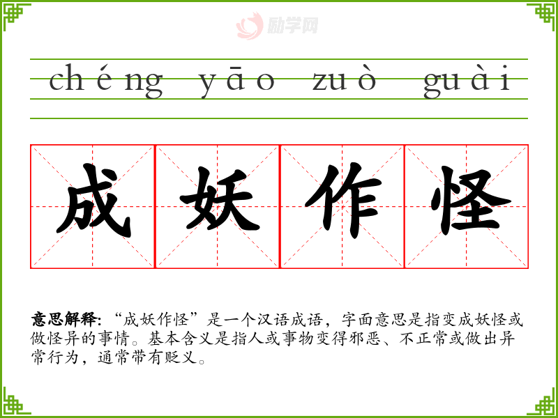 - 口语:在日常口语中,人们常用“成妖作怪”来形容某人行为古怪、不正常或故意捣乱。