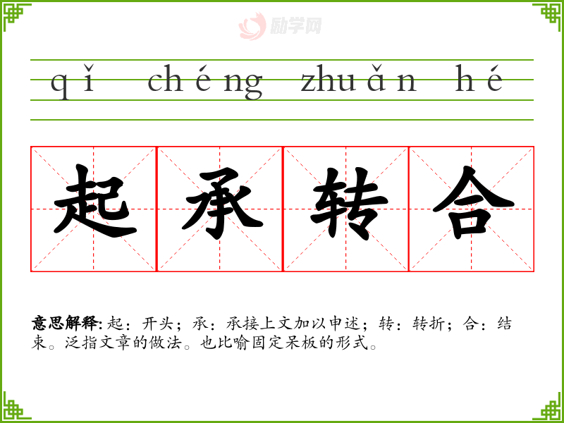 起:开头;承:承接上文加以申述;转:转折;合:结束。泛指文章的做法。也比喻固定呆板的形式。