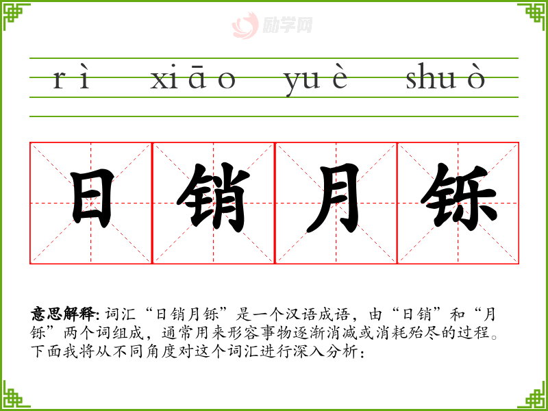 词汇“日销月铄”是一个汉语成语,由“日销”和“月铄”两个词组成,通常用来形容事物逐渐消减或消耗殆尽的过程。下面我将从不同角度对这个词汇进行深入分析: