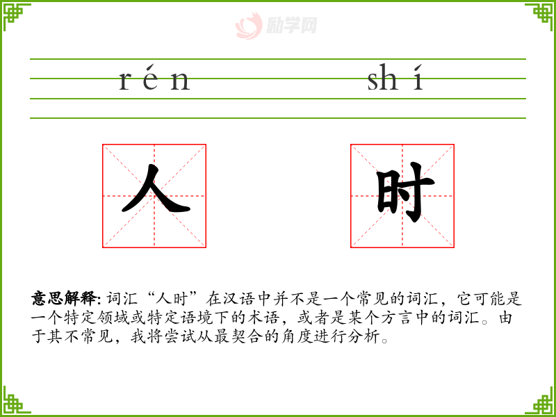 词汇“人时”在汉语中并不是一个常见的词汇,它可能是一个特定领域或特定语境下的术语,或者是某个方言中的词汇。由于其不常见,我将尝试从最契合的角度进行分析。
