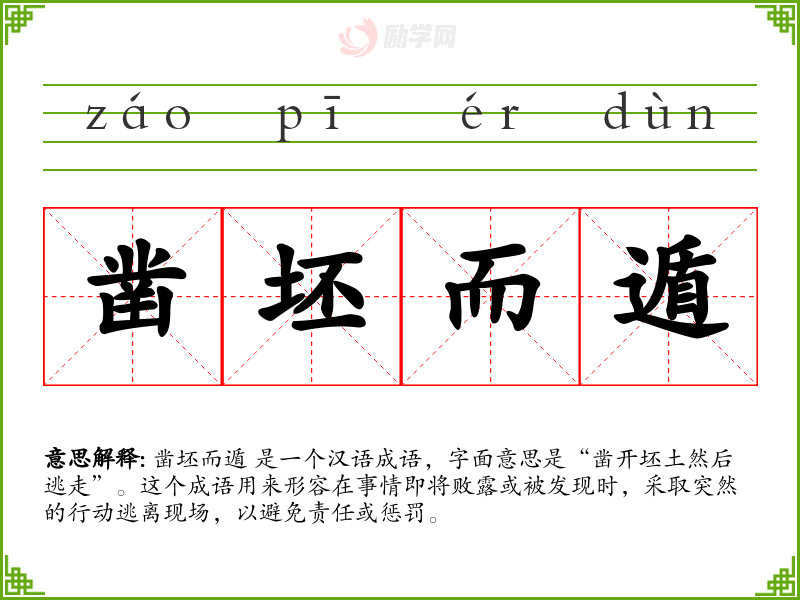 凿坯而遁 是一个汉语成语,字面意思是“凿开坯土然后逃走”。这个成语用来形容在事情即将败露或被发现时,采取突然的行动逃离现场,以避免责任或惩罚。