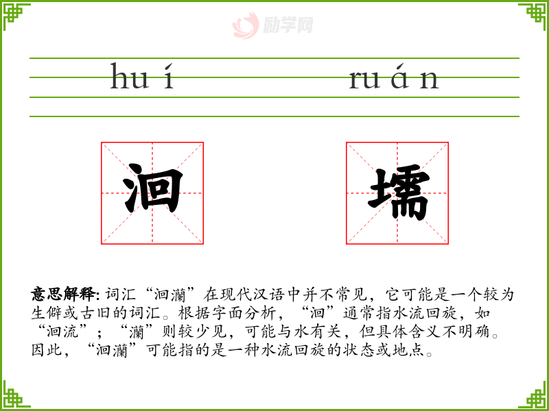 - 理解:“洄灡”是一个描述水流回旋的古旧词汇,虽然在现代汉语中不常用,但在文学和历史研究中仍有其价值。