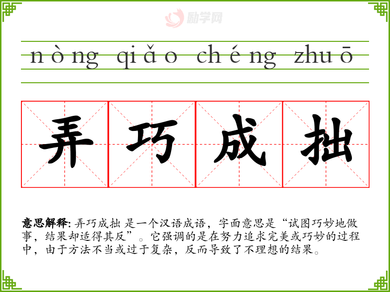弄巧成拙 是一个汉语成语,字面意思是“试图巧妙地做事,结果却适得其反”。它强调的是在努力追求完美或巧妙的过程中,由于方法不当或过于复杂,反而导致了不理想的结果。