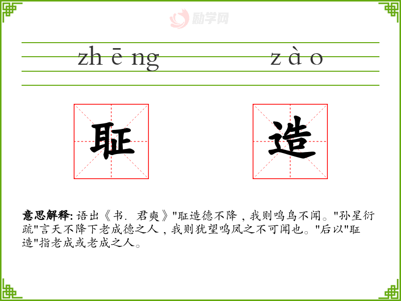 聇造的意思是:语出《书.君奭》"聇造德不降﹐我则鸣鸟不闻。"孙星衍疏"言天不降下老成德之人﹐我则犹望鸣凤之不可闻也。"后以"聇造"指老成或老成之人。