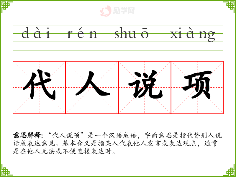 “代人说项”是一个汉语成语,字面意思是指代替别人说话或表达意见。基本含义是指某人代表他人发言或表达观点,通常是在他人无法或不便直接表达时。