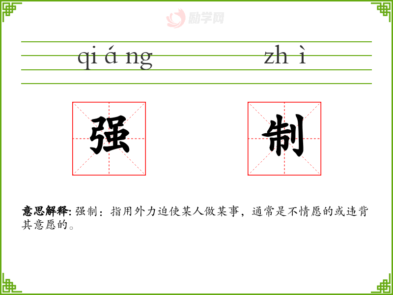 强制:指用外力迫使某人做某事,通常是不情愿的或违背其意愿的。